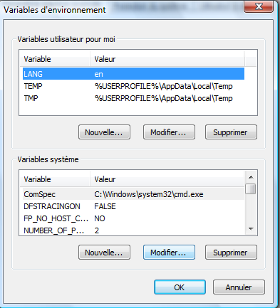 Vous cliquez tout en bas de cette fenêtre sur le bouton "Variables d'environnement". Pour info, une variable d'environnement n'a rien mais alors rien à voir avec l'écologie, c'est juste un truc qui peut varier (une variable quoi) et qui est valable pour tout le système ou tout le compte utilisateur.